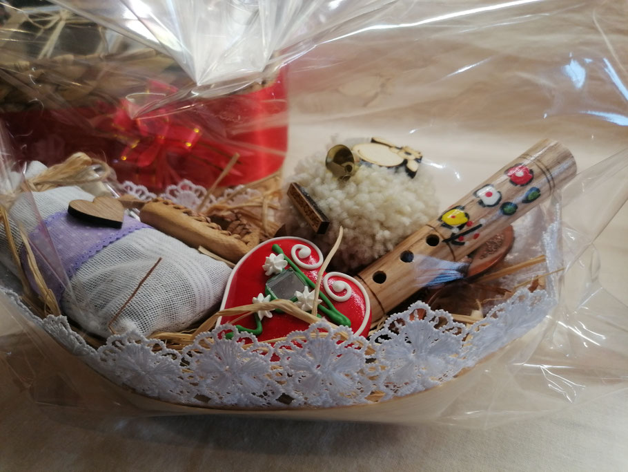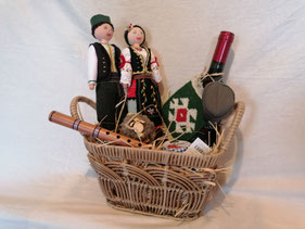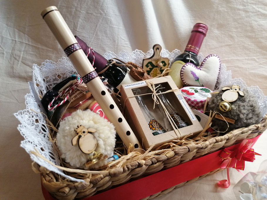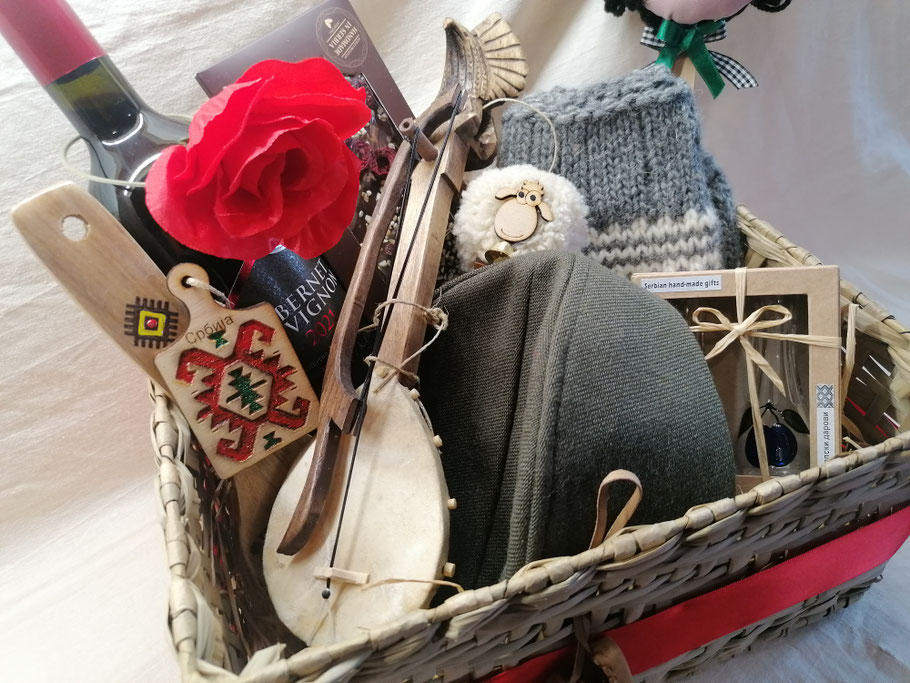 ETNO KORPA - Varijanta 3: Ova etno korpa može da sadrži različite naše proizvode kao što su: frula, frulica, guslice, mini ćilim, veći ćilim, tkanica-pojas, opančići, magnet za frižider, varjača, itd, ali može da sadrži i prehrambene proizvode kao što su hrana ili piće, koji se posebno plaćaju našim kooperantima koji su registrovani za proizvodnju i prodaju hrane i pića.