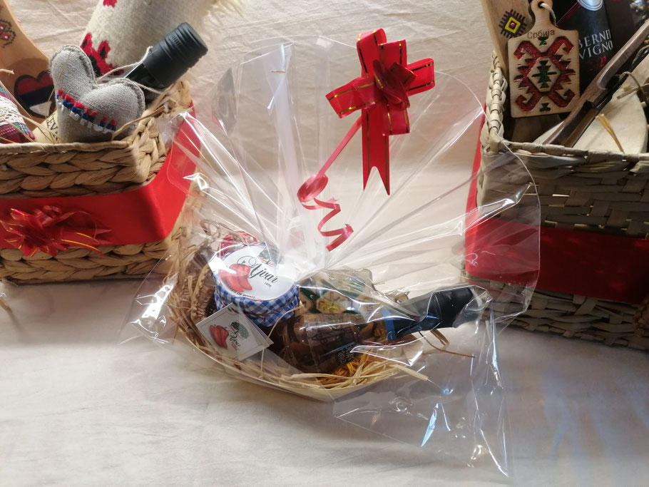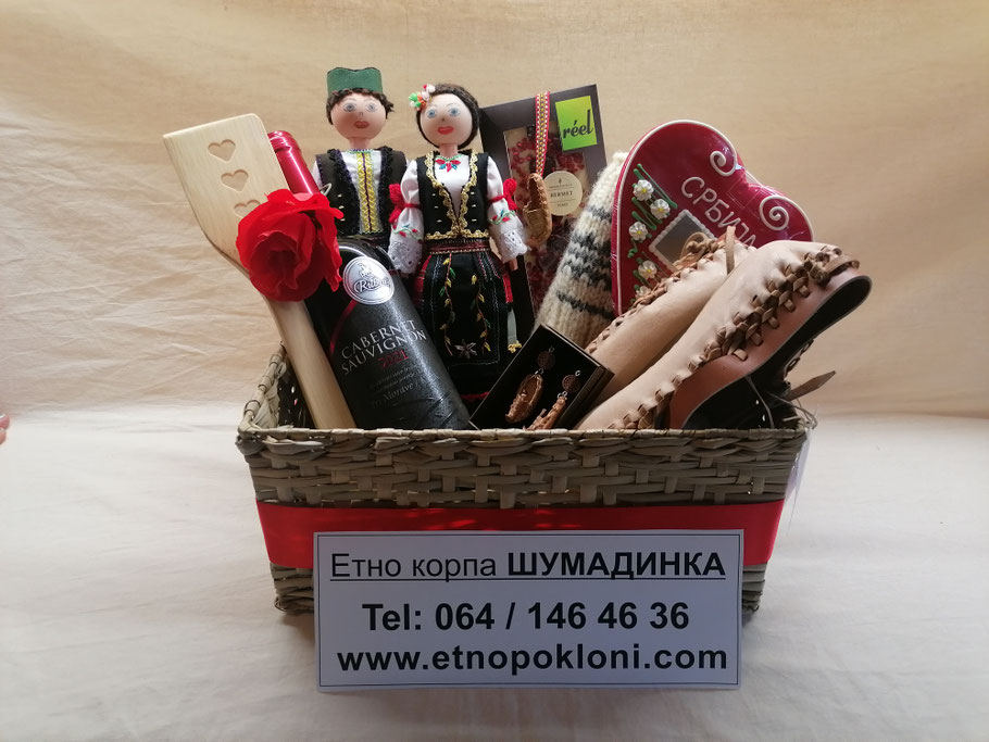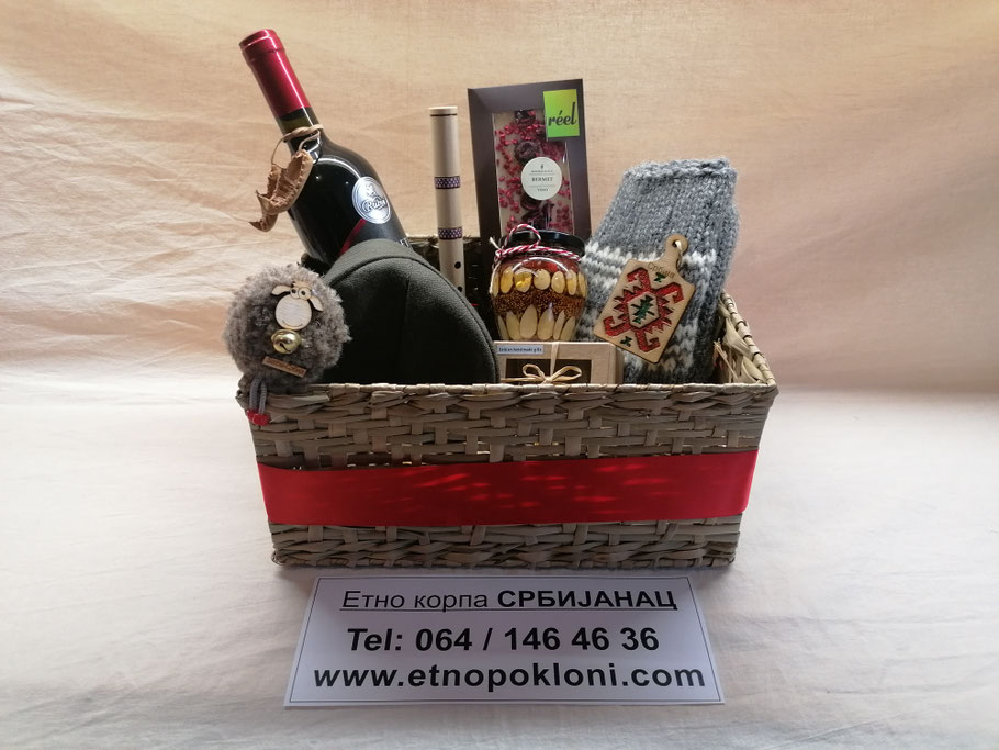 1.) Etno korpa "Šumadinka" (da se bolje vidi sadržaj korpe, slikali smo bez celofana i mašne, koje naravno dobijate uz korpu, odnosno korpu dobijate upakovanu u celofan)