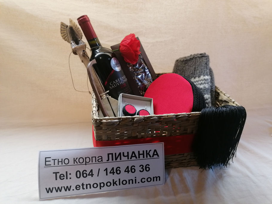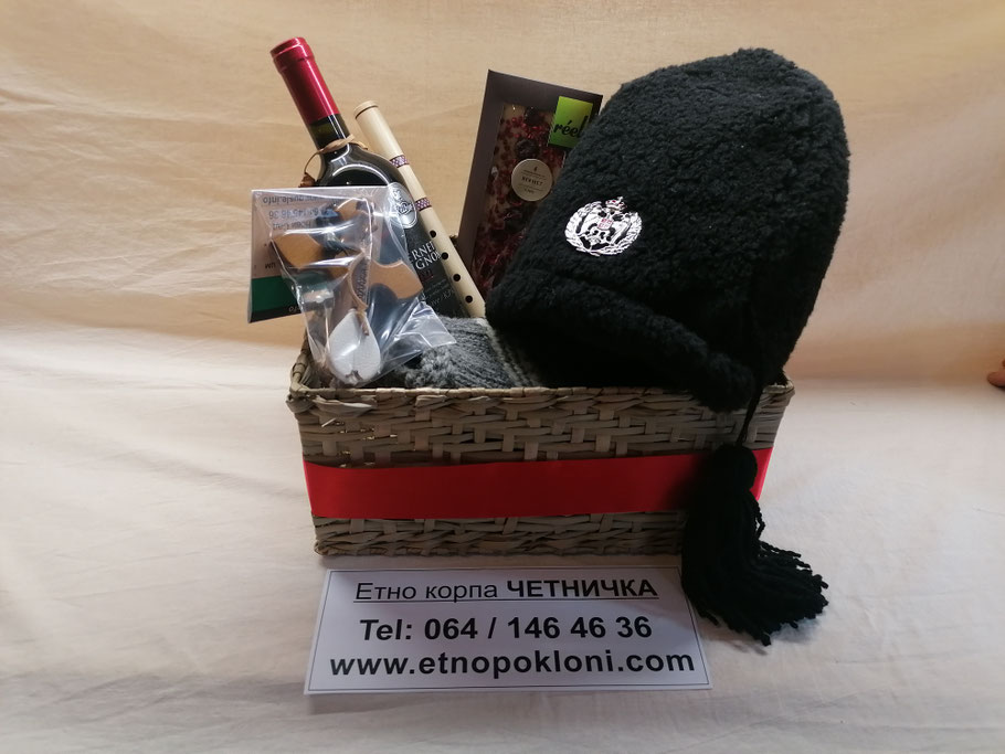 7.) Etno korpa "Četnička" (da se bolje vidi sadržaj korpe, slikali smo bez celofana i mašne, koje naravno dobijate uz korpu, odnosno korpu dobijate upakovanu u celofan)