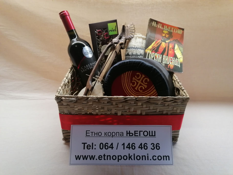 6.) Etno korpa "Njegoš" (da se bolje vidi sadržaj korpe, slikali smo bez celofana i mašne, koje naravno dobijate uz korpu, odnosno korpu dobijate upakovanu u celofan)