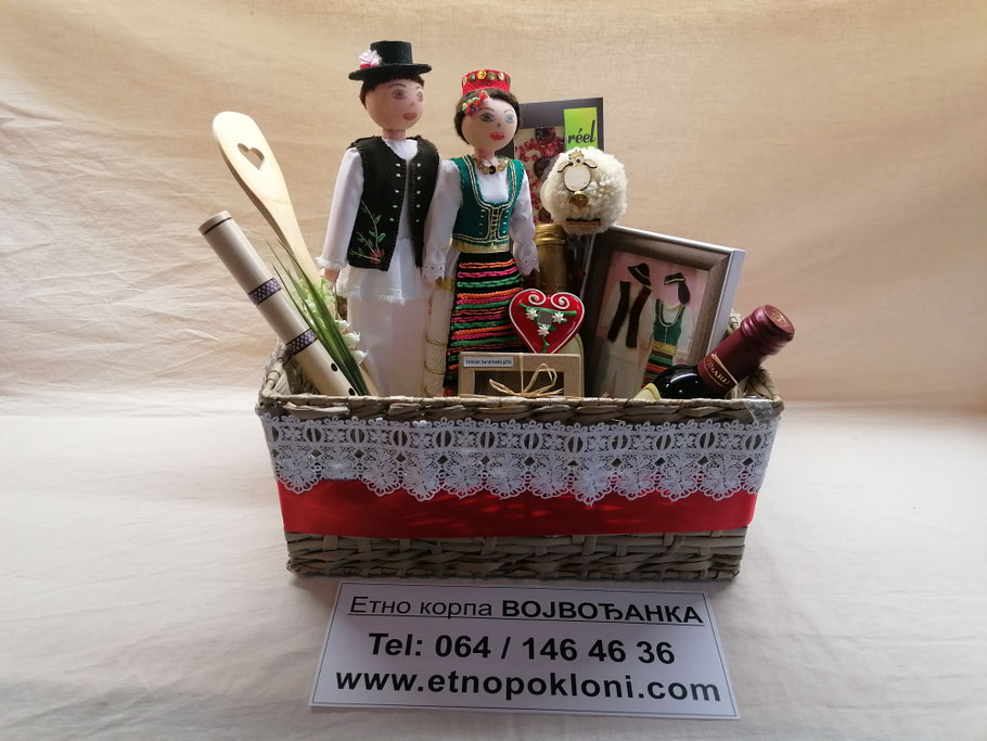 2.) Etno korpa "Vojvođanka" (da se bolje vidi sadržaj korpe, slikali smo bez celofana i mašne, koje naravno dobijate uz korpu, odnosno korpu dobijate upakovanu u celofan)