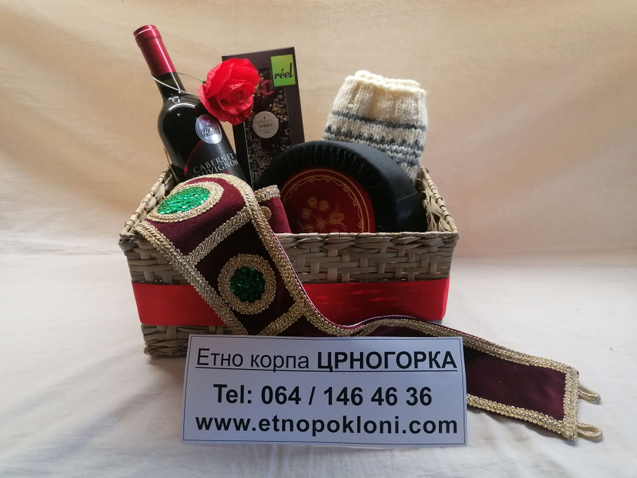 4.) Etno korpa "Crnogorka" (da se bolje vidi sadržaj korpe, slikali smo bez celofana i mašne, koje naravno dobijate uz korpu, odnosno korpu dobijate upakovanu u celofan)